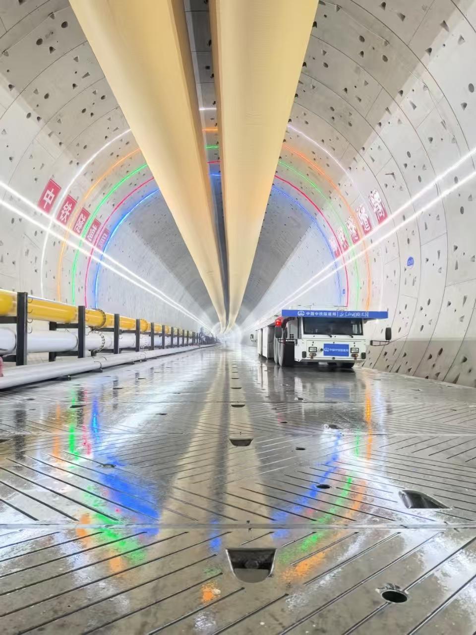 绵延十多公里的隧道内,每隔500米便装设蓝、红、绿、黄、白五色灯带。行驶在平整的箱涵路面上,两侧的LED灯带如流光飞逝,如同在长江水下画出一道道“彩虹”。