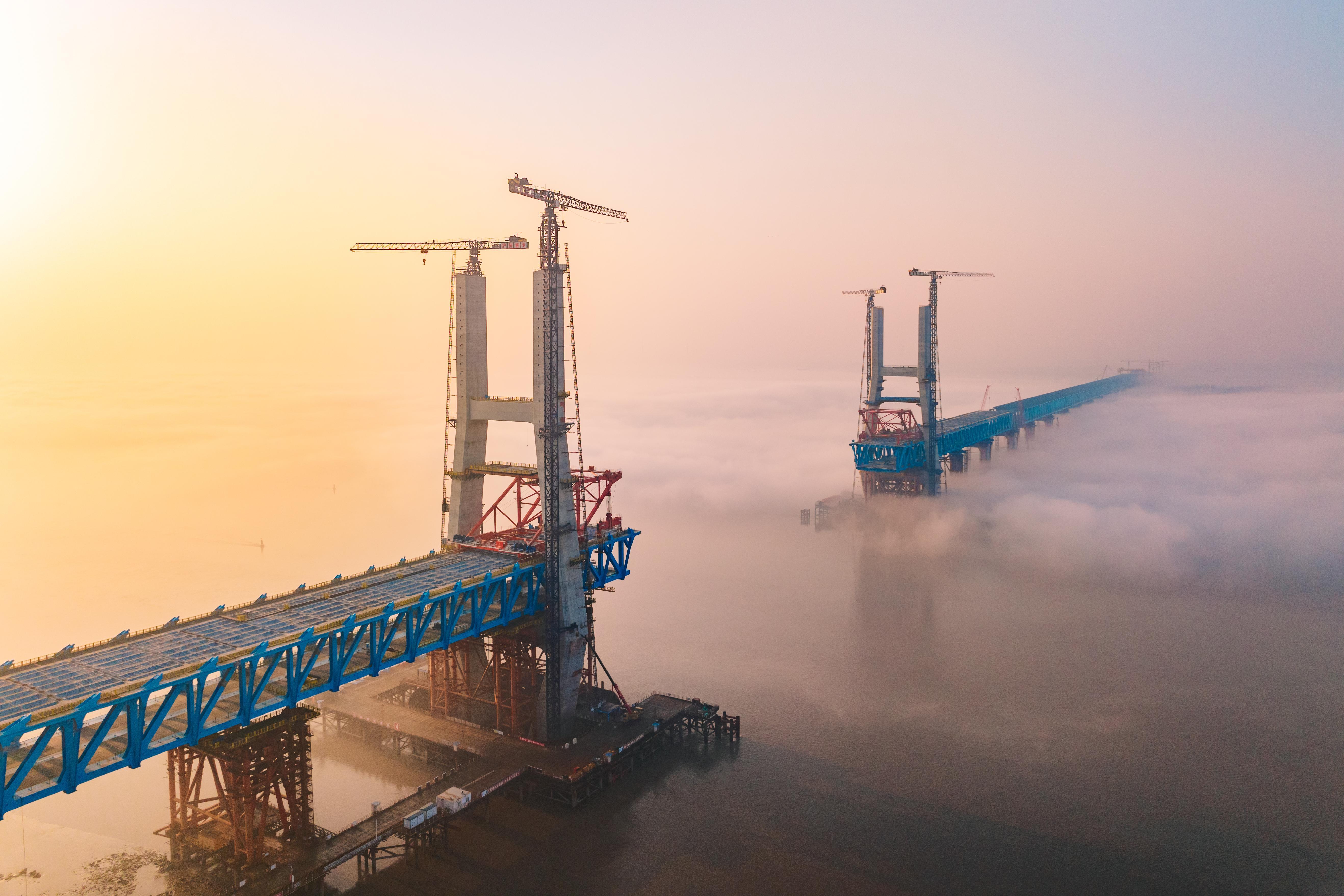 桥面,机械轰鸣、焊花如瀑;桥下,墩柱林立,江水急流。站在岸边高坡远望,两座高耸的桥塔刺破江雾,湛蓝的钢桁梁从两岸伸向江心,准备“握手”。