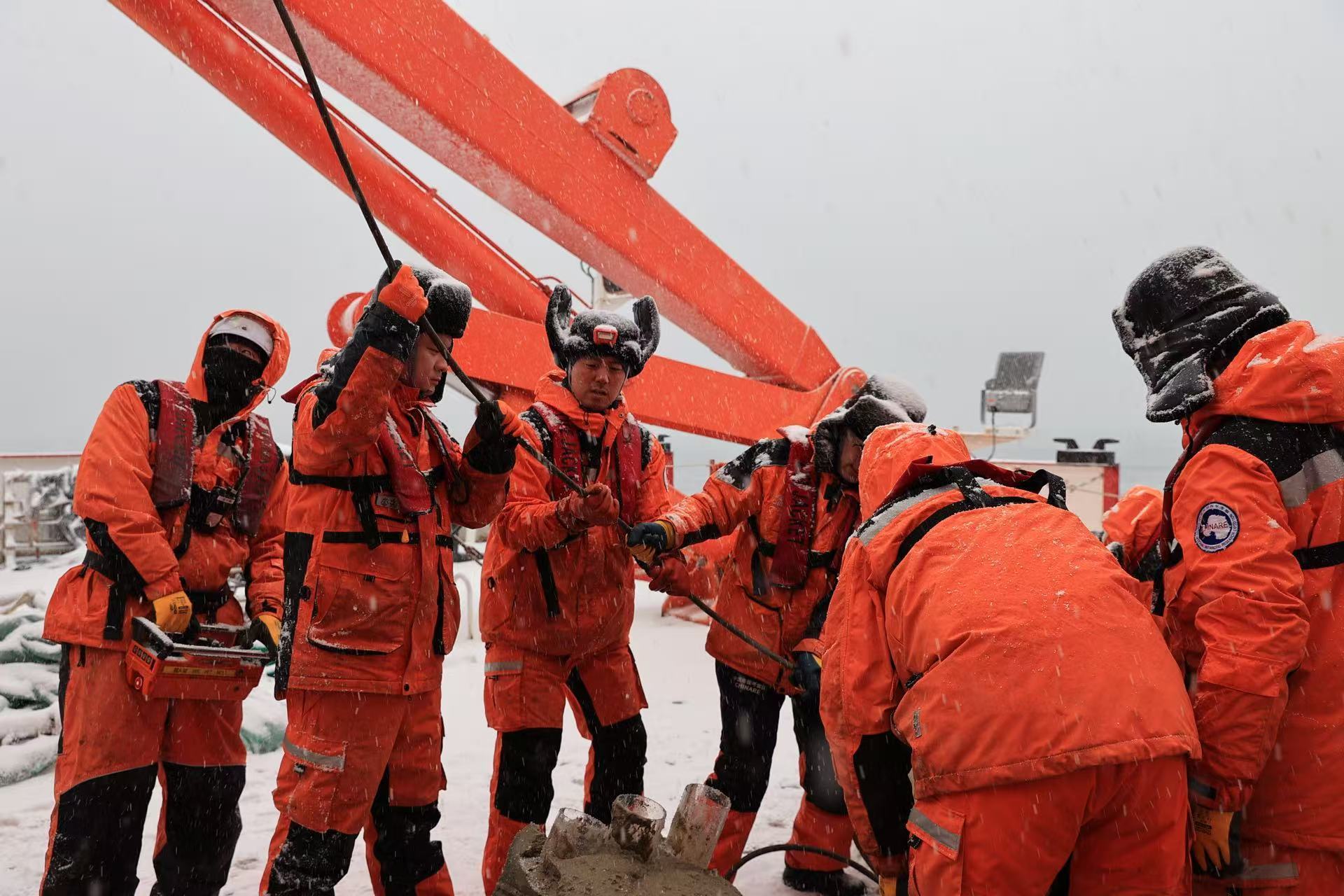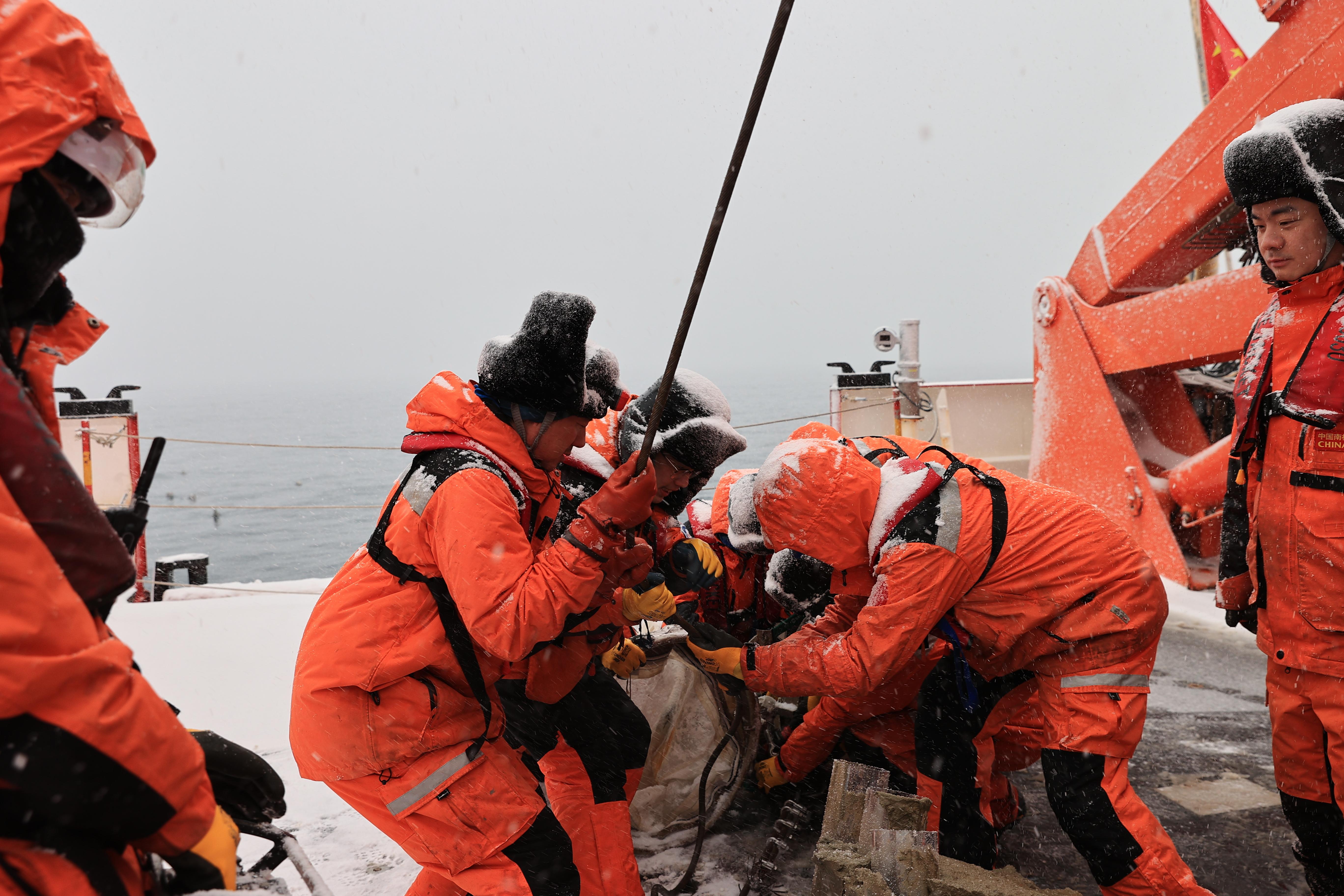 考察队员在风雪中开展艉甲板作业。科技日报记者 毕文婷 摄